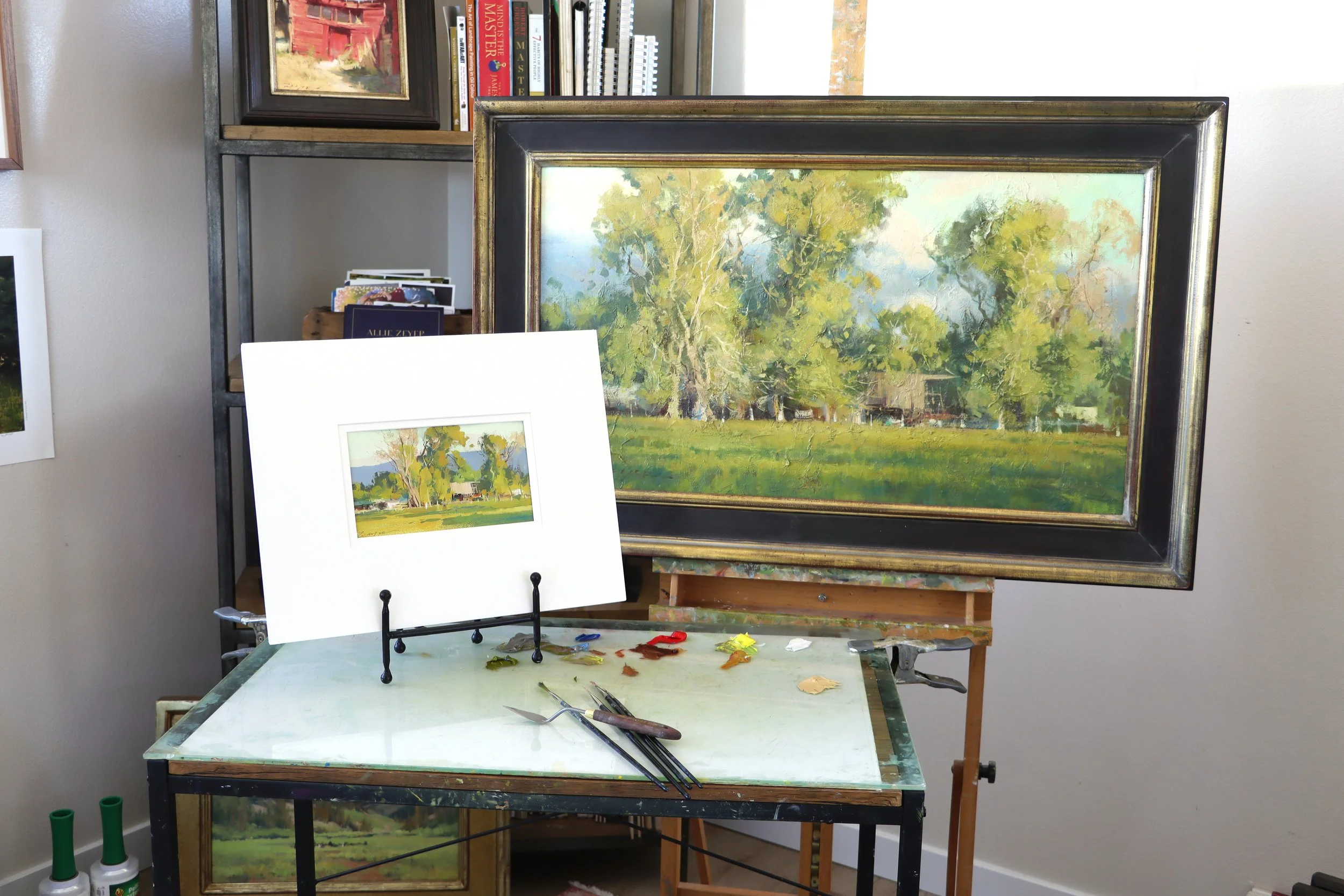 Many layers of oil paint, cold wax, dry brushing, and glazing were used to achieve the impressionistic texture for the oil painting. This is the most thrilling part of the painting process for me!